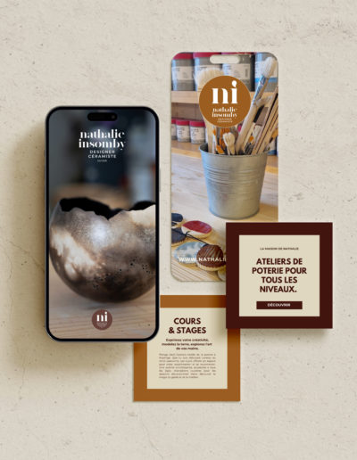 Souhaitant clarifier et harmoniser son image, Nathalie m’a contactée pour repenser son identité visuelle et définir une ligne graphique cohérente pour ses créations, ses ateliers et ses cours de poterie à Puplinge. L’enjeu était de traduire son univers avec justesse, tout en apportant lisibilité et élégance à l’ensemble de sa communication. Nous avons choisi de partir d’une identité semi-personnalisée, dont la simplicité, la féminité et la délicatesse correspondaient parfaitement à ses attentes. Cette base graphique a ensuite été déclinée sur son site internet et ses réseaux sociaux afin d’assurer une cohérence globale. Un shooting photo est venu compléter le projet, révélant toute la sensibilité de son travail et l’âme de ses créations, inspirées par l’esthétique Wabi-Sabi. Aujourd’hui, Nathalie Insomby dispose d’une identité forte et assumée, qu’elle est fière de présenter et de déployer auprès des galeries.